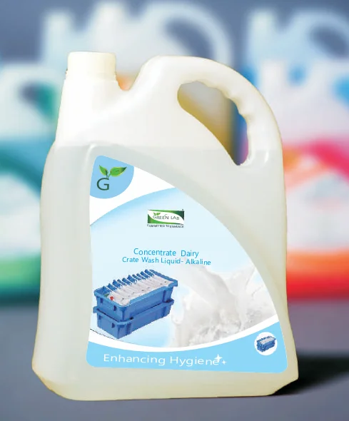 is premium concentrate, high performance dairy crate wash alkaline liquid, designed to easy cleaning of diary crates. Unique formulation with high cleaning efficiency. Penetrates and clean efficiently. Synergic system allows to use at various application. Alkaline pH provides easy and deep cleaning. Will not left residuals on cleaned surface in proper cleaning. This product is not to apply on aluminum surface. Will not allow cleaning residues to redeposit on cleaned surfaces